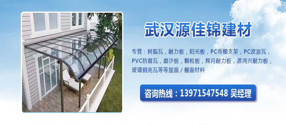 武漢市源佳錦建材有限責任公司是一家從事屋面/棚面/墻面材料的廠家,專營:樹脂瓦,耐力板,陽光板,PC雨棚支架,PC波浪瓦,PVC防腐瓦,磨沙板,顆粒板,輝月耐力板,源鴻興耐力板,玻璃鋼亮瓦,鋁隔熱瓦,長城板,鋁隔熱板等等屋面/棚面/墻面材料!規格可以按您要求定制。公司始終堅持把產品質量視為企業生存的基礎,把滿足客戶的要求視為企業的宗旨,把誠信負責作為經營理念。歡迎來電咨詢!